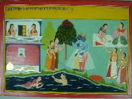 | Description / विवरण | Miniature painting based on Mahabharat - Adi parva depicting Krishna and Arjun enjoying with women while taking bath in river Yamuna. |
