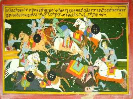 | Description / विवरण | Miniature painting based on Harivansha depicting a fierce war scene between the army of king of Magadh, Jarasandha and the army of Krishna and Balram. Balram is charging with his plough. |