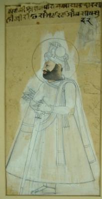 | Description / विवरण | Miniature painting depicting king Sardar Singh of Jodhpur in standing position facing right. He is holding a sword in his left hand and touching the handle of katar with his hand. He is wearing a jama and a turban. This painting is unfinished. |