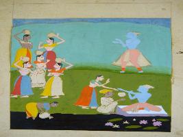 | Description / विवरण | Miniature painting based on Rasikpriya depicting Krishna teasing and breaking the water pitchers carried by Radha and the gopis. This painting is incomplete. |