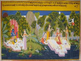 | Description / विवरण | Miniature painting based on Geet Govind depicting friend of Radha telling Krishna about Radha. She is telling him about Radha s pain of separation from Krishna and her Virah vedna . |