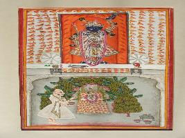 | Description / विवरण | At top Srikrishna is shown raising armed. Blue colour Srinathji is shown in white cloth. Stick in one hand, flower and garland is shown at top. |