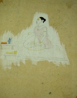 | Description / विवरण | Miniature painting depicting king worshipping Sri Nath ji. He is sitting in padmasana on a mat. It is an unfinished painting. |