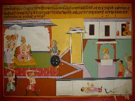 | Description / विवरण | Miniature painting based on Prithviraj Raso depicting Prithviraj sitting on throne in his palace hearing a soldier, two soldiers are depicted fighting, on the other side a king is depicted standing on a Chhatri and one man sleeping and a snake rushing to him. |