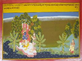 | Description / विवरण | Miniature painting based on Geet Govind depicting Krishna and Radhika seen on the bank of river Yamuna. |