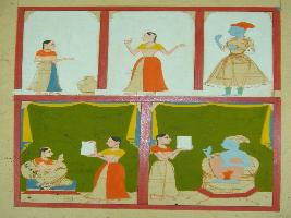 | Description / विवरण | Miniature painting based on Rasikpriya depicting Krishna arriving to meet Radha. At the lower part Radha and Krishna are being shown each other s pictures. This painting is incomplete. |