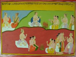 | Description / विवरण | Miniature painting based on Mahabharat - Adi parva depicting that king is performing a yagna. After the yagna is finished, he gives donation to Brahmans and they bless him. |