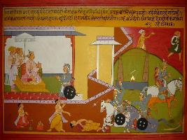 | Description / विवरण | Miniature painting based on Prithviraj Raso. king Jaichand is depicted sitting on throne and hearing a soldier, on the lower part two Brahmans depicted performing yagna. On the other part Prithviraj is depicted taking away Sanjogita on horse and two warriors depicted pointing a spear to a Brahman. |