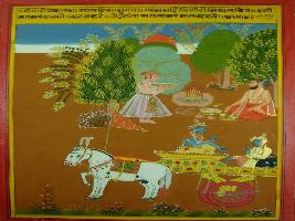 | Description / विवरण | Miniature painting based on Shri Bhagwat Gita. It depicts Krishna preaching Arjun that one who have knowledge and pure heart and works for sake of other he will be paid by me for the good deeds as moksha. |