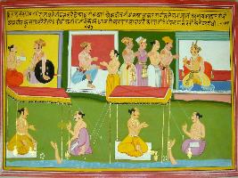 | Description / विवरण | Miniature painting based on Harivansha depicting Bhishma sitting with a sage who is reading Shradh Katha to him at upper the right part. To the left, he is shown giving alms to a sage. At the extreme left, he is shown with Meethi and Shantanu. At the lower right, Bhishma is sitting with Shantanu, and a hand is a appearing from a river. At the lower left, the hand is giving four boons to Bhishma. |