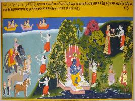 | Description / विवरण | Miniature painting based on Geet Govind depicting Krishna seen seated in the centre of the painting and Kamdev is standing in front of him. In this painting Kamdev s bow is compared to Radha s eyebrows and arrow with her comments Kathas and with the help of them he wins all the three loks. |