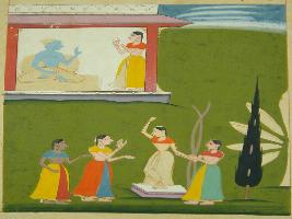 | Description / विवरण | Miniature painting based on Rasikpriya depicting Krishna being told about the condition of Radha, in upper part of the painting. While in lower part, Radha is in pain of separation. It is an incomplete painting. |