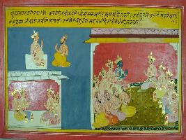 | Description / विवरण | Miniature painting based on Mahabharat - Udyam parva depicting Karbaya sage is telling why Krishna is going to meet Karna. It also depicts Janmejaya talking to Ved Vyas. |