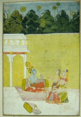 | Description / विवरण | Miniature painting depicting Krishna sitting on couch with flower in hand and two gopis seating in front of him. |