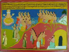 | Description / विवरण | Miniature painting based on Mahabharat - Adi parva depicting that king Mahaji goes to meet Brahma in heavens. Where he sees that all Rishis are talking to Brahma about how vayu had stolen clothes of Ganga and Ganga curses king for that. |