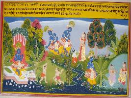 | Description / विवरण | Miniature painting based on Geet Govind, two female friend depicted talking. It is scene of Krishna meeting Radha in Vrindavan. Here Radha is complaining Krishna about his ignorance towards their love. Then Krishna says that her words are hurting him as sharp arrows. |