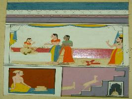 | Description / विवरण | Miniature painting based on Rasikpriya Probably depicting Nayika and her friends in upper part of the painting and a Nayak in the lower part of the painting. It is an incomplete painting. |