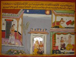 | Description / विवरण | Miniature painting based on Prithviraj Raso depicting Prithviraj praising the beauty of Hansavati in front of her. He is also praising the beauty of atmosphere. It also depicts their loving union. |
