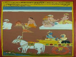 | Description / विवरण | Miniature painting based on Shri Bhagwat Gita. It depicts Krishna preaching Arjun one who find out akarma in karma, and karma in akarma that person is known as intelligent among all human beings. And who knows about yoga he knows about all karma. |