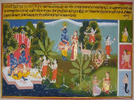 | Description / विवरण | Miniature painting based on Geet Govind depicting Krishna talking to Kamdev about his bow and arrow of love and its impact on the peoples. |