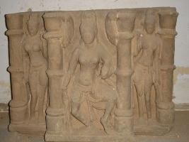 | Description / विवरण | A sculptured architectural fragment depicting three female figures in different niche. At the centre one female figure is in dancing, position. In her right hand she is holding her drapery, and holding a fruit in her left hand. She is adorned with jewels like garland, bangles and earring. She is wearing a girdle, tussels of which reaches upto her knee. At her both sides two female chanwari bearers are depicted holding chanwari. They are adorned with jewels and wearing a girdle and are in standing posture. |