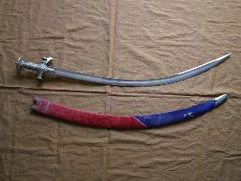 | Description / विवरण | Sword is having a curve sharp cutting edge with mid rib at the top and the other side with a notch and also a sharp cutting edge blade. Its hilt is decorated with floral motifs in Jar-Nishan work.. It is provided with a leather cover with a brass tip Kholia . |