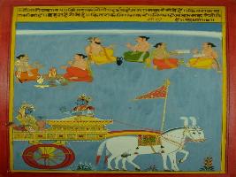 | Description / विवरण | Miniature painting based on Shri Bhagwat Gita. It depicts Krishna preaching Arjun that some yogis perform yagna for Devtas, some perform yagna for Agni and some worship for Brahma but all those yagna come to me. |