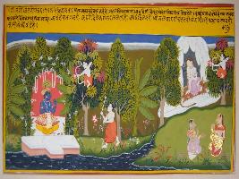 | Description / विवरण | Miniature painting based on Geet Govind depicting Virah , the pain of separation of Krishna, Radha and Mahadev. All of them are attacked by arrow of Kamdev. |