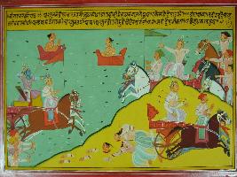 | Description / विवरण | Miniature painting based on Mahabharat - Virat parva depicting fighting scene between Arhuna and Dronacharya in Virat war. On both side, arrows are being shooted. Arjun shoot 1000 arrow together over Drona and Ashwathana is coming to rescue of Drona. Arjun is fighting such as which Drona could never think. Drona got hurt while fight and leaving. |