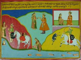 | Description / विवरण | Miniature painting based on Mahabharat - Adi parva depicting birth of Bhishma. Shantanu met Ganga in guise of female while going for hunting in forest. They got married and Ganga gave birth to 7 sons but she drowned each of them just after their birth. Bhishma who as their eighth son was saved by king Shantanu. |
