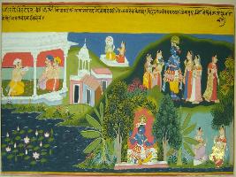 | Description / विवरण | Miniature painting based on Geet Govind, two friends are depicted talking, Krishna is depicted doing Raas Lila in Vrindavan with gopis and Radha, on the other side a house is depicted with three people. |