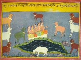 | Description / विवरण | Miniature painting based on Mahabharat - Udyam parva depicting 10 cows come out during the Samundramanthan which depicts all 10 direction and many sages are doing meditation by drinking their milk. |
