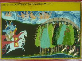 | Description / विवरण | Miniature painting based on Mahabharat - Adi parva. A scene from Khandav vadh. Arjun is seen with bow and arrow while Krishna has the Chakra. On top Devtas are seen including Indra. |