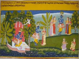 | Description / विवरण | Miniature painting based on Geet Govind depicting Krishna seated on the right hand side of the painting and Kamdev thrown arrow on him and on its left Krishna talking with Radha and on the left hand side of the painting Krishna standing in between the gopis. |