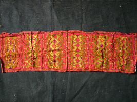 | Description / विवरण | It is a rectangular piece of cloth having base colour red with gurjari work. Irregular geometrical designs on central part of cloth in Gurjari work in mehendi green and blue colour on red ground. Thread work is done border in geometrical designs. |
