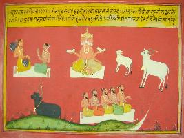 | Description / विवरण | Miniature painting based on Mahabharat - Udyam parva depicting when Matli, the Chartioter of Indra took Narad to pataal loka he saw cow Surabhi who give 6 kinds of milk that she got from Brahma. By drinking her milk many sages survives and doing meditations. |