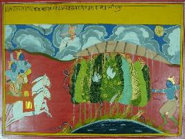 | Description / विवरण | Miniature painting based on Mahabharat - Adi parva depicting a seen of Khandav vadha where the Khandav is seen coming with fire and Krishna and Arjun are seen with bow and arrow and Chakra. On top Indra is seen. |