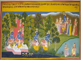 | Description / विवरण | Miniature painting based on Geet Govind, two friends are depicted talking Krishna is depicted doing Raas Lila with gopis and Radha in Vrindavan. |