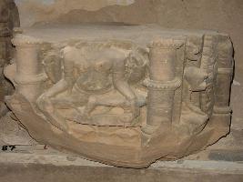 | Description / विवरण | An independent sculpture of a four armed female deity, sitting in lalitasana on a lotus flower, in a niche. Attributes from the right below 1 resting on right knee in Abhaya mudra , 2 mace 3 chopped off 4 Kamandal. The upper part from the head and lower part with the right leg are chopped off. |