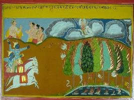| Description / विवरण | Miniature painting based on Mahabharat - Adi parva. The painting depicts Krishna and Arjun. A scene of Khandav vadh is seen. Where Indra is seen on top. |