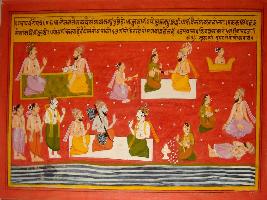 | Description / विवरण | Miniature painting based on Mahabharat - Gada parva depicting the conversation between Janmejaya and Baispayana. Baispayana is telling Janmejaya about sage Kalinga, wife of whom used to do fasting and worship Shiv, one day Narad came and says that she will get trilokas. |