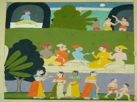 | Description / विवरण | Miniature painting based on Rasikpriya Probably depicting on the upper part Nayaka probably Krishna sitting in a garden. At the left of him some boys are seen. At the centre, Nayaka is talking with his friends. At the lower part Nayika probably Radha is seen with her friends. This painting is incomplete. |