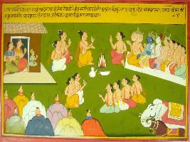 | Description / विवरण | Miniature painting based on Mahabharat - Gada parva. This painting depicted. Coronation of Skanda Kumar Kartik Swami as commander in chief of gods army yagna is being performed and guru Brihaspati is giving ahuti to Brahma, Vishnu, Shiv, Indra with other gods are shown participainting ceremany and shown sitting. |