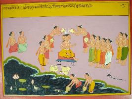 | Description / विवरण | Miniature painting based on Mahabharat - Gada parva depicting the coronation of Skanda Karthika Swami . Brahman gods and Gandharava is shown standing. they gave Kartik who is sitting on couch a bath by throwing water on him from golden pot. |
