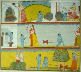 | Description / विवरण | Miniature painting depicting Sri Krishna stealing butter shown in different poses with Yashoda in three rows. |