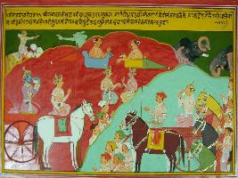 | Description / विवरण | Miniature painting based on Mahabharat - Virat parva depicting Arjun asking Uttar to take chariot toward Dhronacha.When both of them is coming towards each other for fight, it looks as if two elephants are coming tofight Then they started blowing conch. At the upper part, king Indra is shown killing Viratsur and at the upper left part, two elephant are shown fighting. |