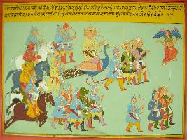 | Description / विवरण | Miniature painting based on Mahabharat - Gada parva depicting army of gods leading by Kartik sitting on peacock going for war with demon. At the front, one apsara is seen dancing. |