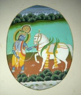 | Description / विवरण | Miniature painting depicting Krishna holding an adorned horse with his both hands. |