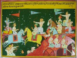 | Description / विवरण | Miniature painting based on Mahabharat - Virat parva depicting war scene between Arjun and Kripacharya. Arjun destroy face of Karipacharya. Then Duryodhan is coming there. Ashwathama took Kripacharya with him and started fighting. |