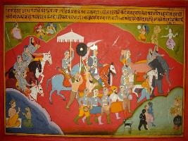 | Description / विवरण | Miniature painting based on Prithviraj Raso depicting Jaichand with his army marching for the battle. Many musical instruments blowing together hearing which Narad, Shiv and apsaras start dancing as if they are rehearsing their dance. |